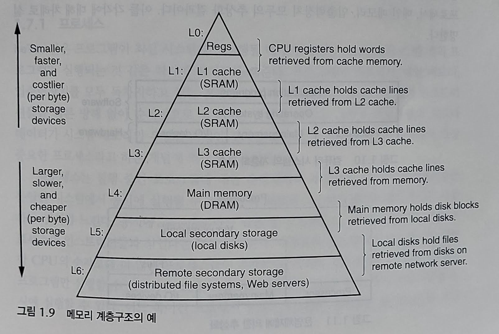 근데 사실 이 과정들을 보면 막 복잡하게 실행하는 과정보다는, bus를 통해 왔다갔다 하는 시간이 더 걸린다. 그래서 이 시간을 줄이는게 관건이라 저장장치들이 계층 구조를 이루게 되었다. CPU는 수백 바이트를 저장하는 레지스터를 읽는것만 있어서 메모리보다 더 빠