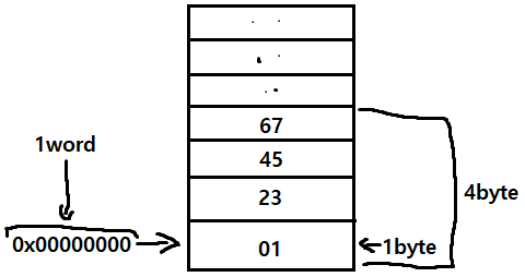 헷갈린건 주소 크기가 1word인거고, 저장 크기가 1bytge인거다. 1word는 cpu가 32-bit, 64-bit에 따라 4byte, 8byte이고, 저장소 크기는 0~2^w-1 범위를 가진다.