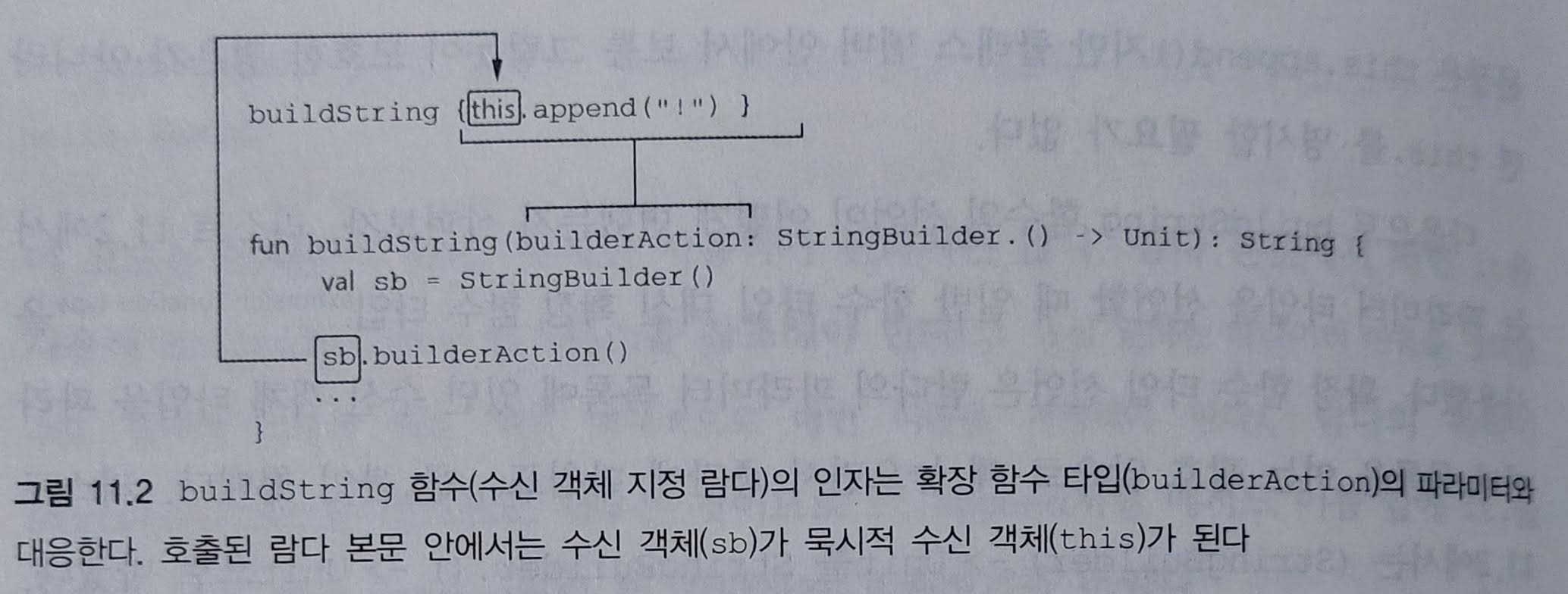 다음은 람다를 인자도 받는 buildString() 정의를 일반적으로 한 것과 수신 객체 지정 람다로 한 방법이다.