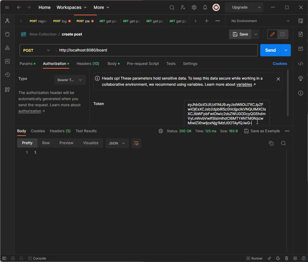 회원가입이나 로그인할 때 jwt token을 발급해서 주고, 게시물 작성 같은 로그인이 필요한 작업을 수행할 때 header에 token도 같이 받아 확인하는 방식. controller에서 token을 확인 후, service에 작성하라고 넘겨준다. 작성 뒤 해당 게시물의 id Long을 반환하게 했다.