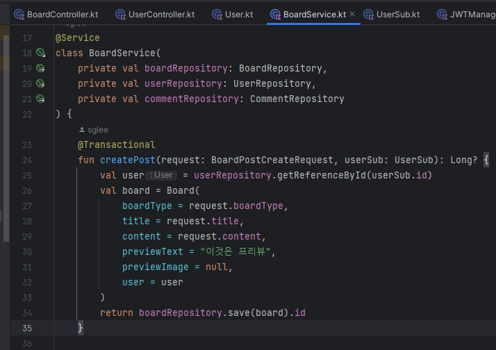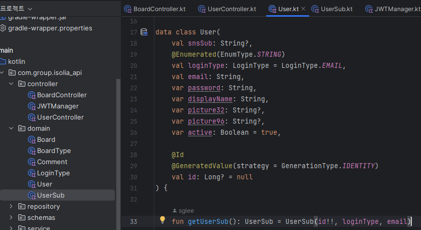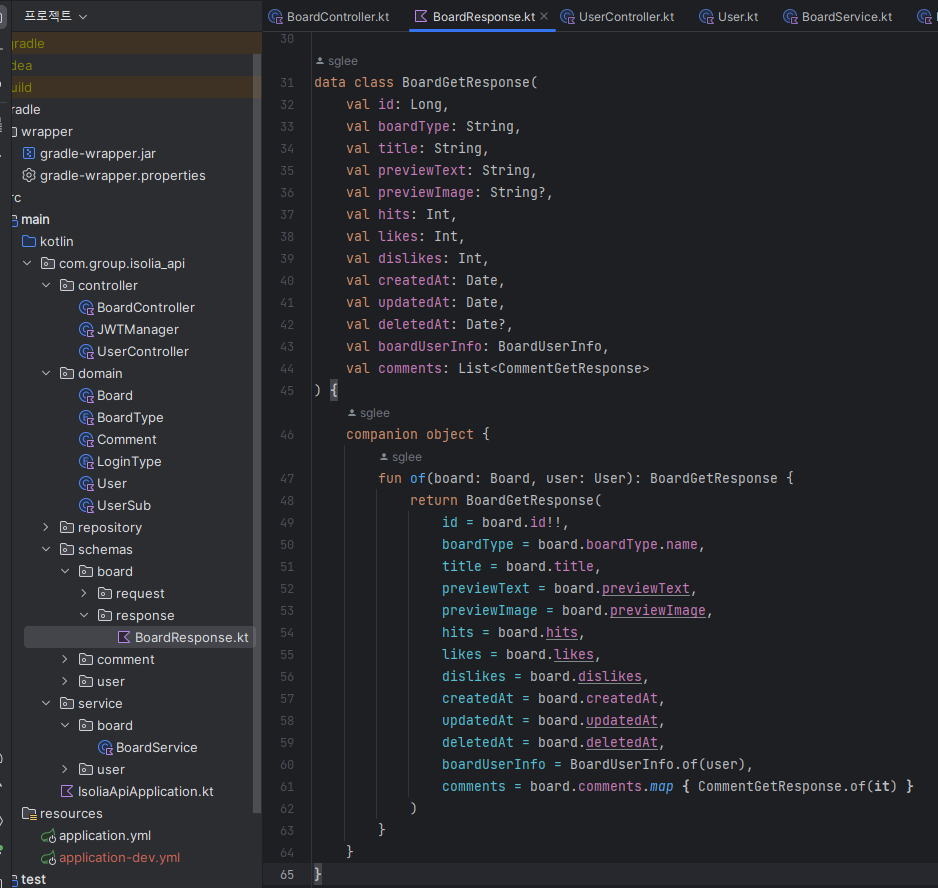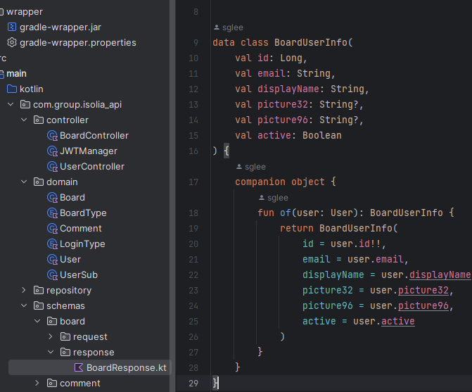 companion object의 of 함수로 저장해서, user나 board같은 엔터티 모델을 주기만 하면 알아서 지정해주도록 하면 코드가 더 깔끔해진다.