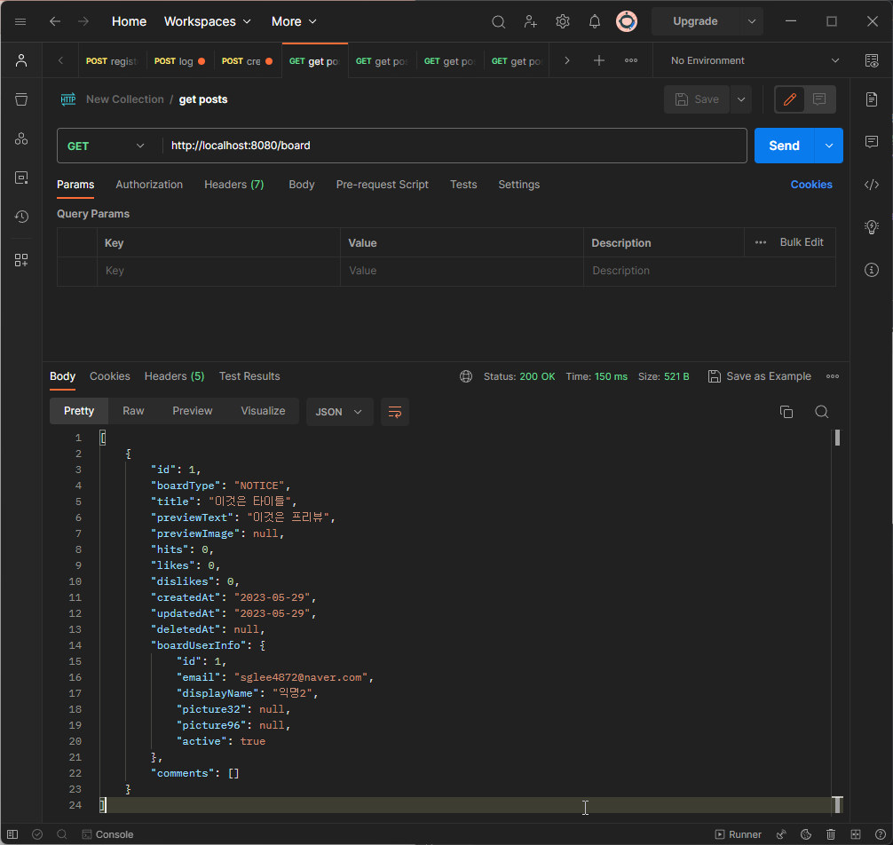이제 이걸 response하는 body를 dto에 response로 정의해준다. 그냥 쌩으로 반납하게 하면 모든 칼럼을 보여주기 때문에 유저의 암호화된 패스워드, 게시물 전체보기에서 preview를 만들었지만 사실 안의 내용도 다 가져오는 등의 낭비가 있기 때문.
