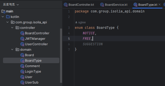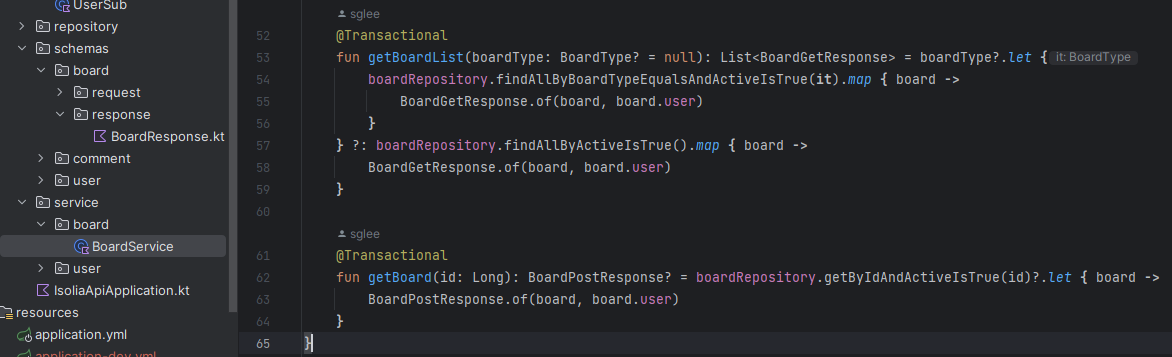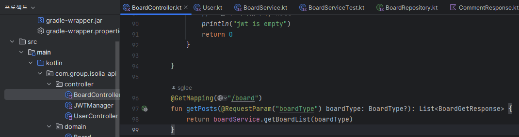 남은 하나는 매개변수 타입이 ?일 때 처리. 현재 BoardType에는 공지, 자유, 제안이 있지만 전체를 불러오고 싶을때를 대비해서 boardType = null일 경우도 만들었는데, 이를 위해 if boardType==null을 사용했지만 Querydsl를 사용하면 더 간단하게 할 수 있다는 것.