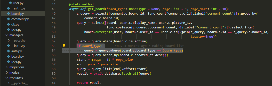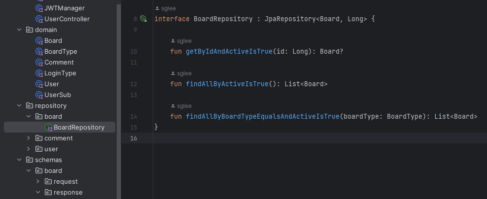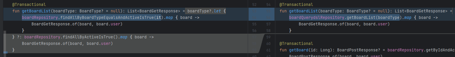 남은 하나는 매개변수 타입이 ?일 때 처리. 현재 BoardType에는 공지, 자유, 제안이 있지만 전체를 불러오고 싶을때를 대비해서 boardType = null일 경우도 만들었는데, 이를 위해 if boardType==null을 사용했지만 Querydsl를 사용하면 더 간단하게 할 수 있다는 것.