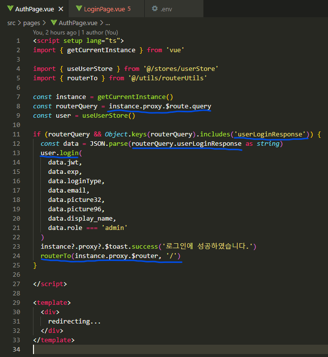 프론트쪽에선 query로 정보를 받을 준비를 한다. 정보가 들어오면 로그인 진행.