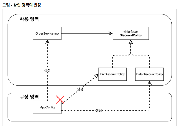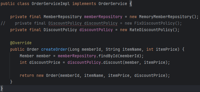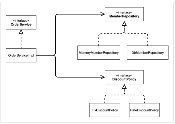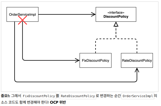 위 코드를 보면 OrderServiceImpl 인스턴스가 다른 인터페이스만 보는게 아니고 인스턴스도 함께 보기 때문에 OCP 위반이다. DiscountPolicy를 다른걸로 바꾸면 인스턴스에도 의존하고 있었기 때문에 OrderServiceImpl도 바꿔야 한다. 아무것도 아니게 되었음. (자동차 운전면어 땄는데 가스차 운전면허증, 전기차 운전면허증 따로 있는 느낌) 역할에만 의존해야 되는데 역할과 구현 둘 다에 의존하고 있다.