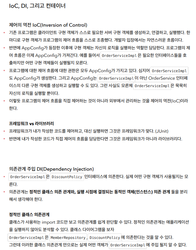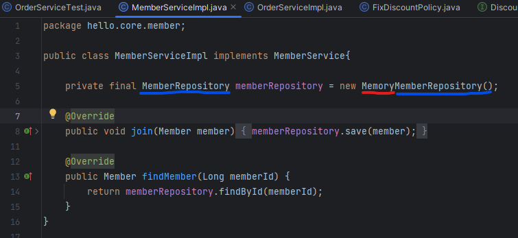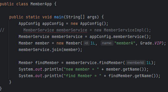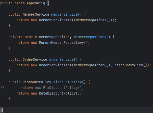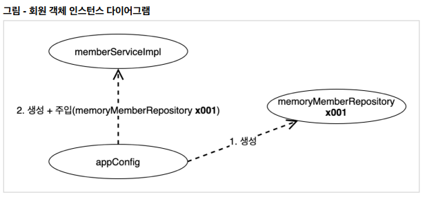 원래 MemberServiceImpl이 MemoryMemberRepository라는 구체화된 인스턴스의 존재를 알고 의존해서 사용했지만, 이제 DI로 바꾼다. 주입은 AppConfig가 해주도록 한다. 그럼으로써, MemberService는 인터페이스라는 존재만 알고 사용하게 되어서 이제 MemberRepository라는 인터페이스만 알면서 구현하여 DIP를 지키고, MemberRepository 구체화 인스턴스를 다른걸로 바꿔도 코드는 전혀 바꾸지 않으므로 OCP도 지킨다.