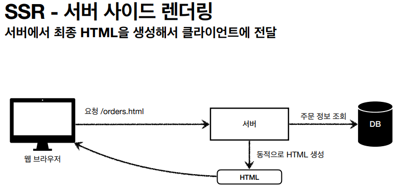 서버 사이드 렌더링은 HTML 자체를 주는 건 같지만, 코드가 작동해서 나오는 동적 HTML 결과를 주는것. 클라이언트 사이드 렌더링은 클라이언트는 서버에서 HTML, javascript를 요청해서 가지고 있고 후에 서버에서 정보를 보내주면 그걸 기반으로 HTML를 만든다.