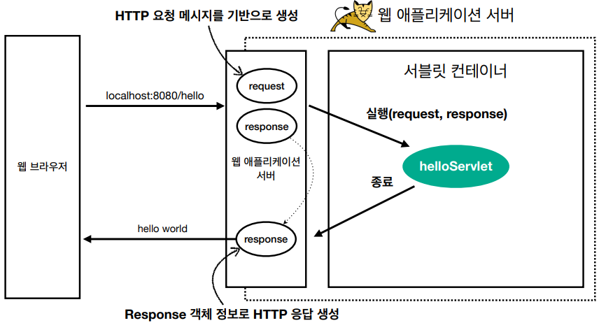 웹 브라우저에서 요청이 오면 웹 서버에선 request 인스턴스와 response 인스턴스를 만들고 코드를 실행시킨 뒤 그 코드의 결과물을 아까 생성한 response에 담아 전달해준다. 즉, 웹 서버는 서블릿의 컨테이너이기도 함.