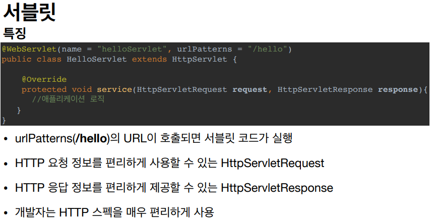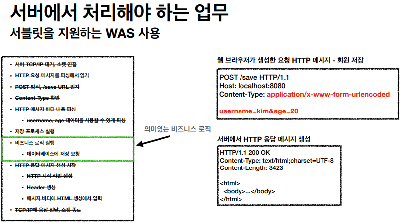 아까 위에서 웹 서버는 HTTP 요청이 오면 알맞은 HTTP 응답을 보내는 것이라고 했는데, 요청 내용 POST /save이런 string들 분해해서 알아내고 응답메세지는 또 만들고... 해야된다. 너무 반복되는 내용이다 보니 이걸 서블릿이라는 애가 자동으로 해줌.