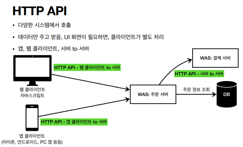 그 다음은 HTML, HTTP API, CSR(클라이언트 사이드 렌더링), SSR(서버사이드 렌더링)을 설명해주는데, 정적 리소스는 이미 서버에 저장되어 있는 html, javascript, css등을 그냥 읽어오는 것이고, html은 요청이 들어오면 WAS가 html 자체를 만들어서 클라이언트에게 주는 것. HTTP API는 클라이언트가 html과 javascript를 가지고 있어서 서버에서 정보만(json 등) 주면 알아서 화면을 표현하는 것이다.
