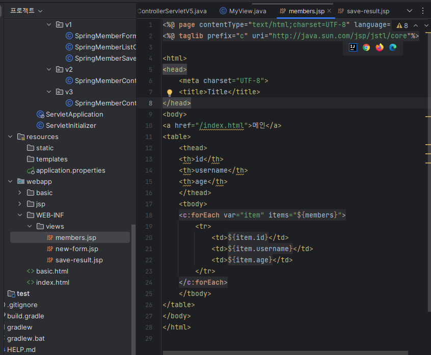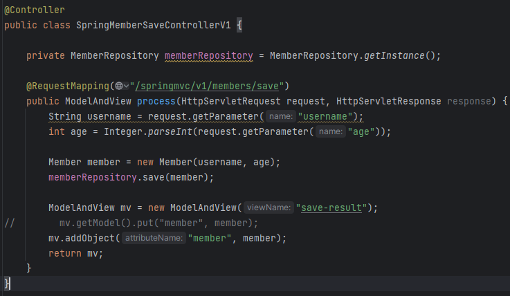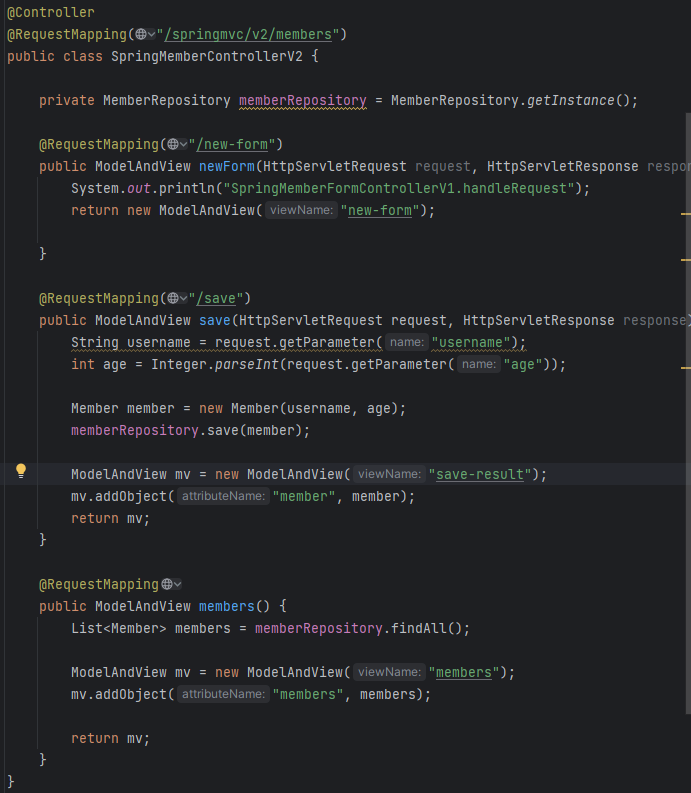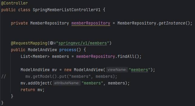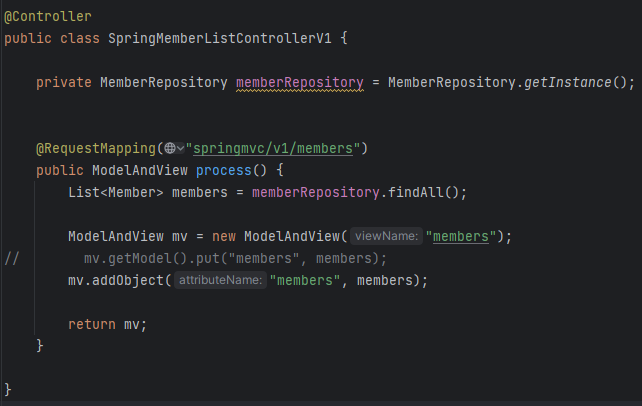 말 그대로 ModelAndView를 반환한다. 만약 받아야 할 query가 있다면 getParameter로 받아오고, 전해줘야 할 게 있다면 내 레퍼지토리든 해서 찾아와 앞에서 배운 이론대로 Model에 추가해서 넣는다(V1은 참고용으로 넣었음).