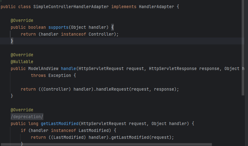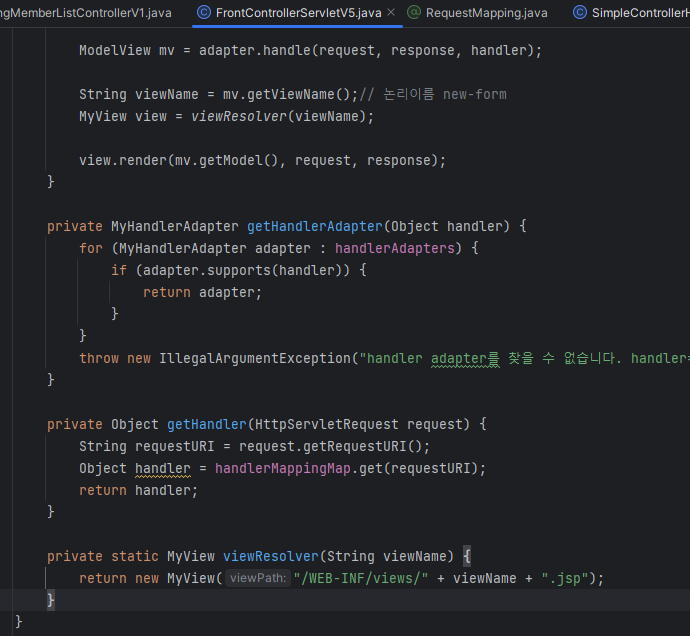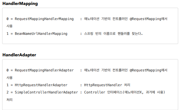 핸들러 어댑터는 기존에는 직접 만들었지만 이젠 스프링껄 그냥 쓴다. 그래서 관련해서 작성한 코드가 한 줄도 없다. 만약 RequestMapping으로 핸들러로 등록했다면 스프링에 등록되어 있는 어댑터 목록에서 RequestMappingHandlerAdapter를 찾아 결국 RequestMapping 핸들러를 실행하는 것이고, BeanName으로 등록했다면 SimpleControllerHandleAdapter를 찾아 BeanName으로 등록한 핸들러를 실행하는 것이다. 핸들러를 찾는 방식은 각 핸들러 어댑터 안에서 요청 받은 핸들러가 자신이 다룰 수 있는 핸들러인지 instanceof를 사용하여 for문으로 돌렸었는데, 실제 내부적으로도 그렇게 찾는다.