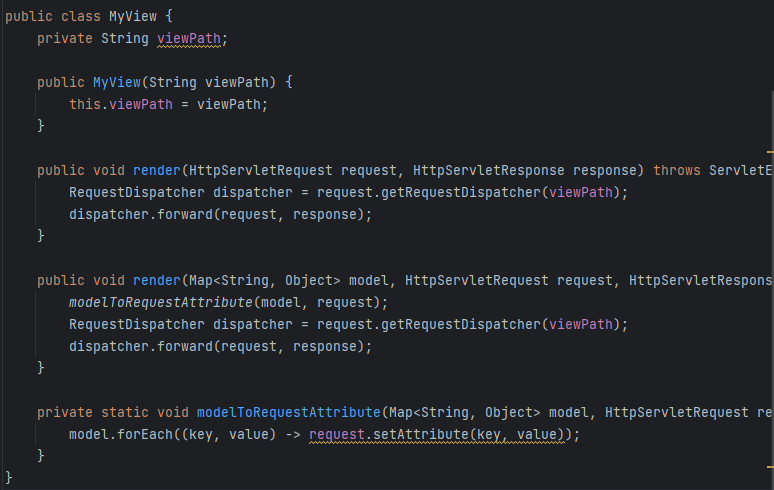 직접 만든 viewResolver같은 경우도 결국 어떤 파일을 html로써 읽어야 하는지 해당 파일 경로를 알려줌으로써 Servlet의 getRequestDispatcher가 해당 경로로 파일을 읽어와 request, response를 통해 필요한 정보를 가져올 뿐이었다.