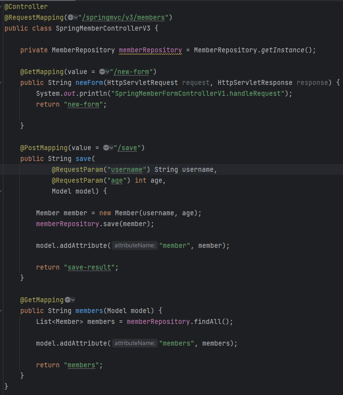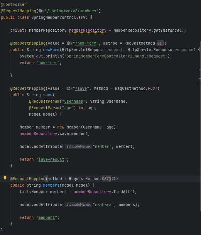 더 개선한 v3버전은 ModelAndView대신 string만 넣어도 알아서 뷰에 매칭해준다. 또 요청 GET, POST에 따라서 정해주는 것도 가능.