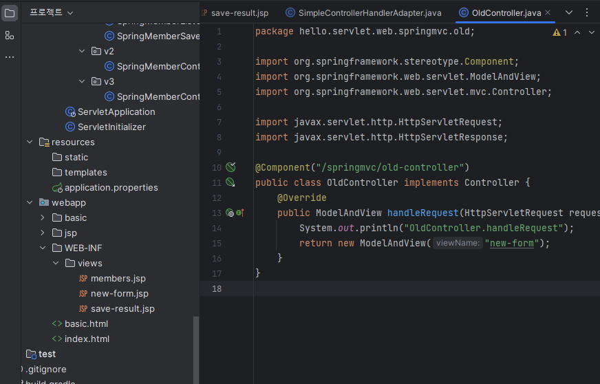 스프링 MVC를 활용하여 만든 V1으로 개선한 버전의 경우, Controller를 상속하는 대신에 @Controller를 사용한다. @Controller 안에는 @Component가 있어서 자동으로 Bean에 등록되어 핸들링 목록에 추가된다. 그래서 사용할 수 있고, 해당 컨트롤러를 다루는 컨트롤러 핸들러도 이미 스프링 내에 있다.