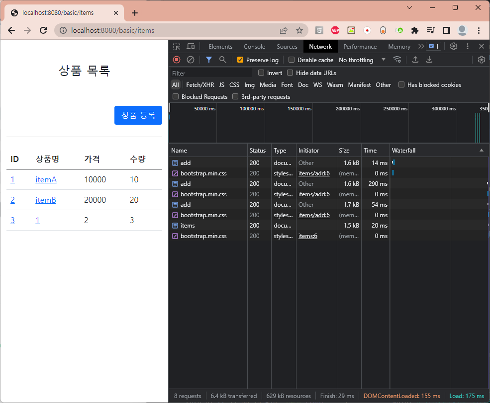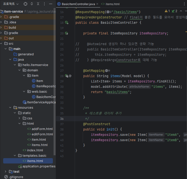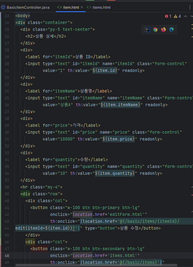 헷갈릴 수 있는데, 클래스의 기본 링크가 /basic/items이니 아이템 상세에 /{itemId}를 붙였으므로 /basic/items/{itemId}가 된다. 뷰로 basic/item에 있는 html를 모델에 데이터를 넣어서 반환하면 thymeleaf가 알아서 해석해서 값을 넣어줘서 해준다.
