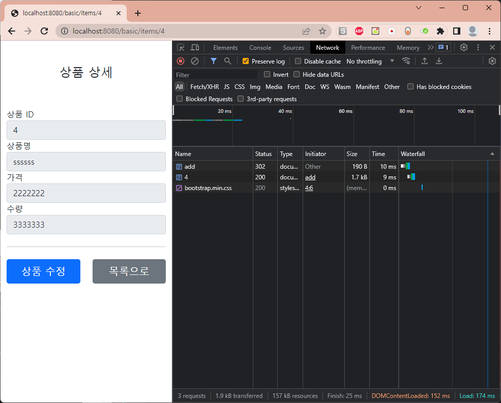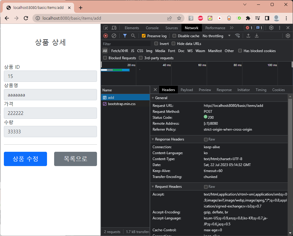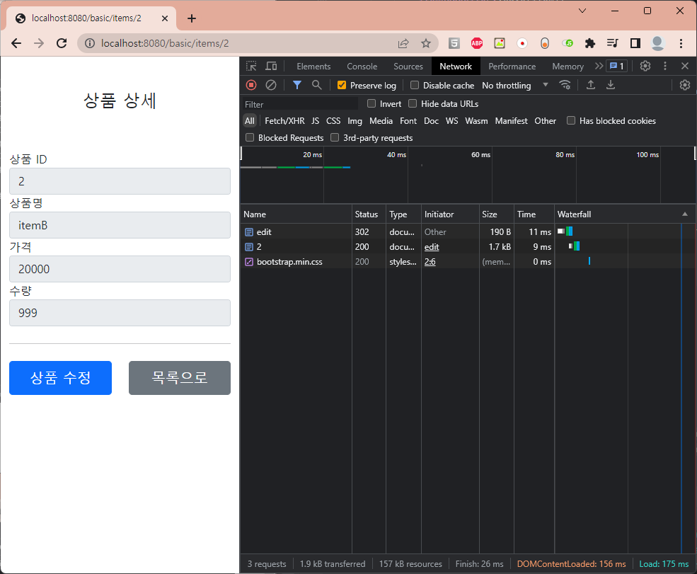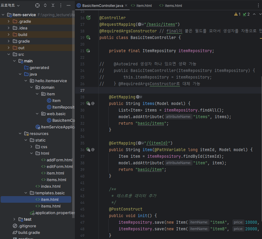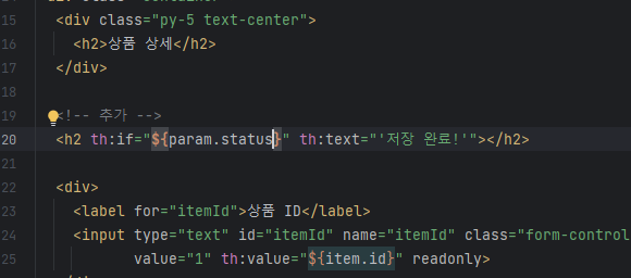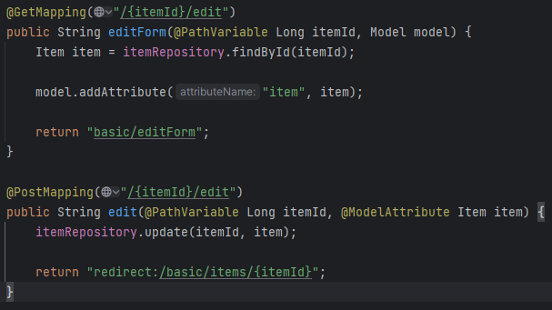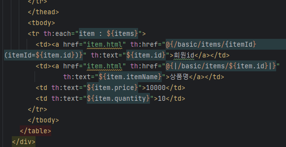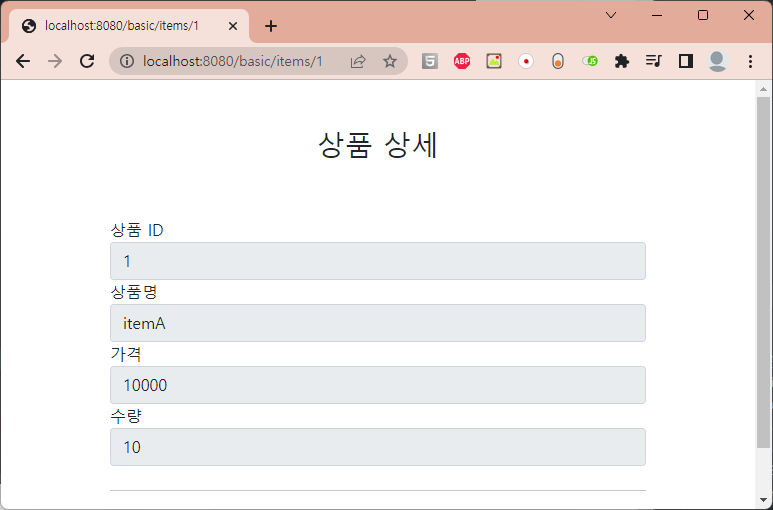 헷갈릴 수 있는데, 클래스의 기본 링크가 /basic/items이니 아이템 상세에 /{itemId}를 붙였으므로 /basic/items/{itemId}가 된다. 뷰로 basic/item에 있는 html를 모델에 데이터를 넣어서 반환하면 thymeleaf가 알아서 해석해서 값을 넣어줘서 해준다.