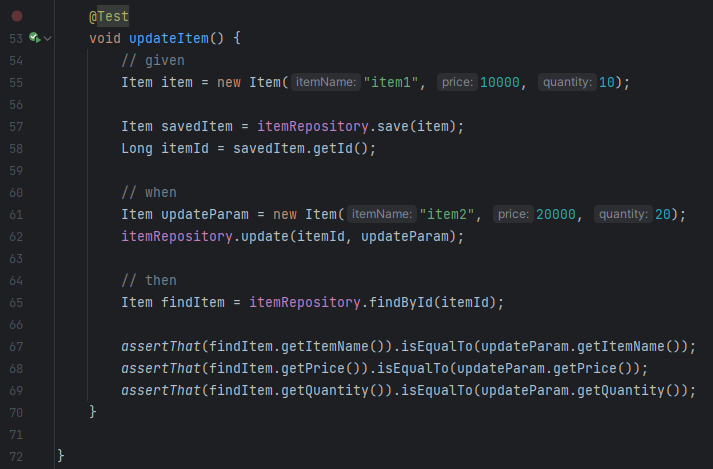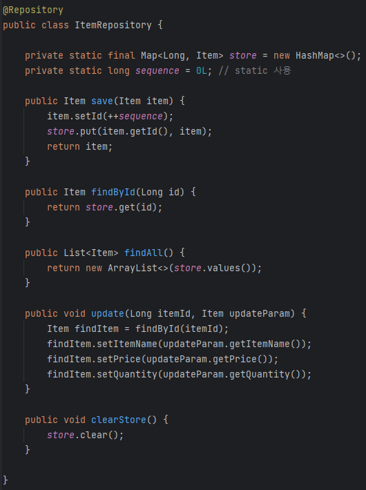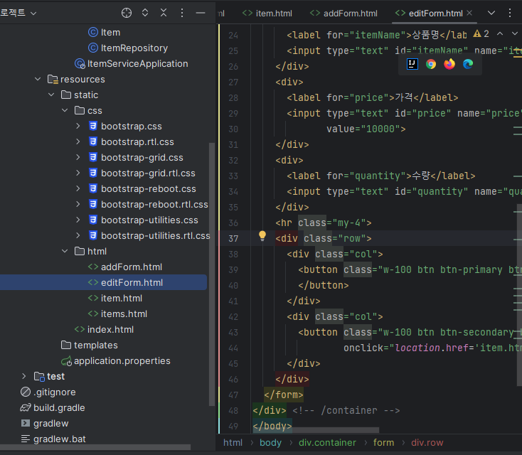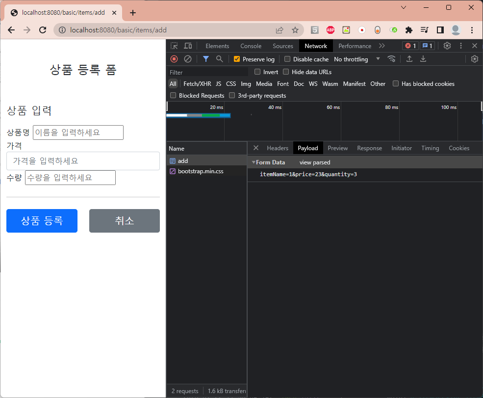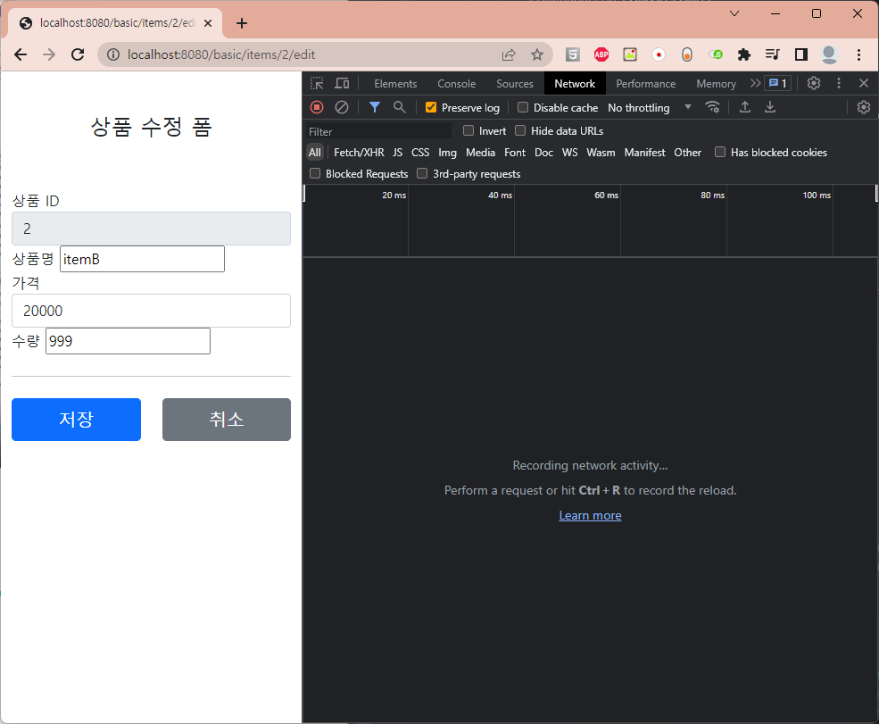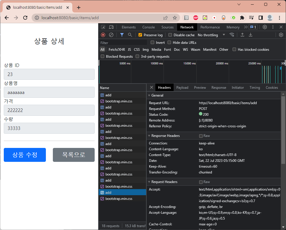 헷갈릴 수 있는데, 클래스의 기본 링크가 /basic/items이니 아이템 상세에 /{itemId}를 붙였으므로 /basic/items/{itemId}가 된다. 뷰로 basic/item에 있는 html를 모델에 데이터를 넣어서 반환하면 thymeleaf가 알아서 해석해서 값을 넣어줘서 해준다.