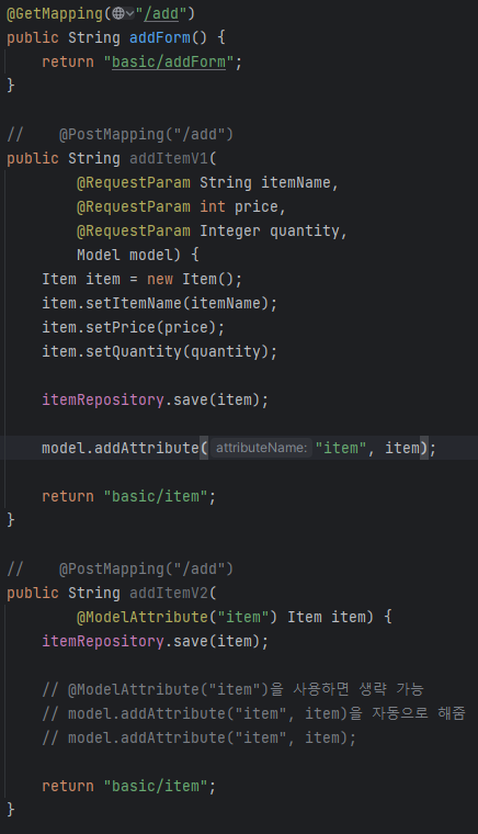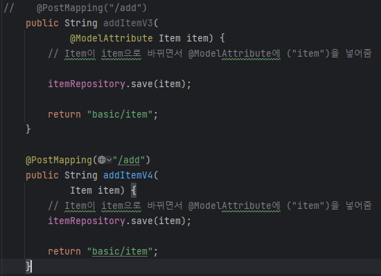 Post 응답을 받는 방법이 여러가지가 있는데 결론은 둘다 form에서 name으로 되어있는 객체를 HTTP POST에 쿼리 방식으로 보내는 걸 해석하는 것이다. 생략되면 단순 Int, String -> ModelAtrribute순으로 받는다고 한게 여기서 나옴.