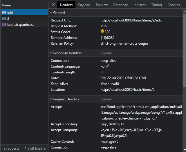 redirect를 썼기 때문에 301을 반환하면 브라우저가 알아듣고 해당 url로 반환한다. html의 form은 put, patch를 지원하지 않기 때문에 post를 사용한 것이다.