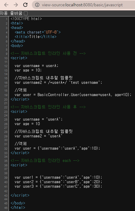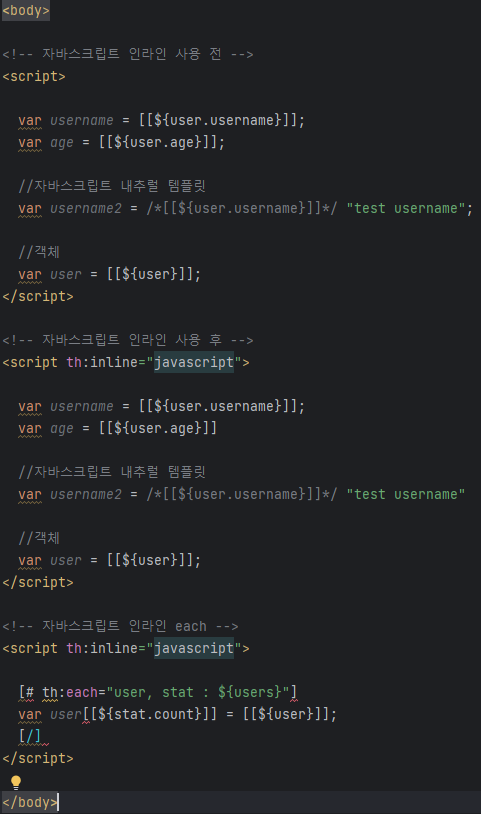 타임리프는 자바스크립트에서 타입리프를 편리하게 사용할 수 있는 자바스크립트 인라인 기능을 제공한다.