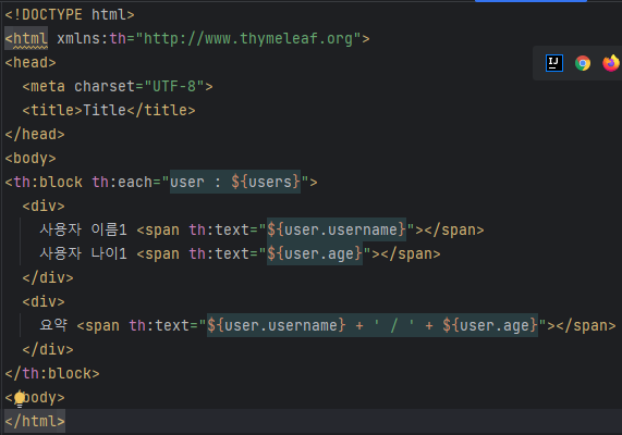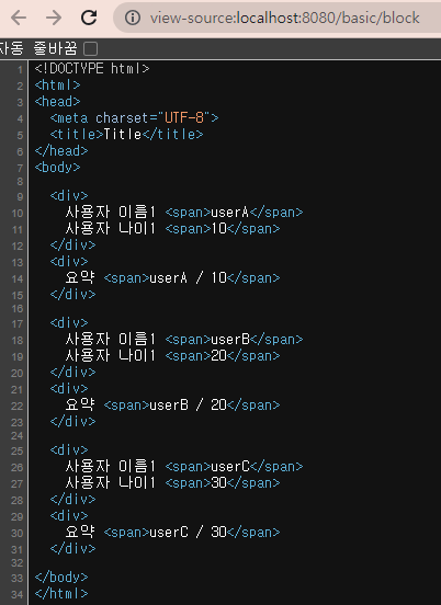 지금은 each문으로만 하기 어려울 때. 한줄 한줄 다 해야 하니. block은 html 정식 태그가 아니니 렌더링할 때 사라진다.