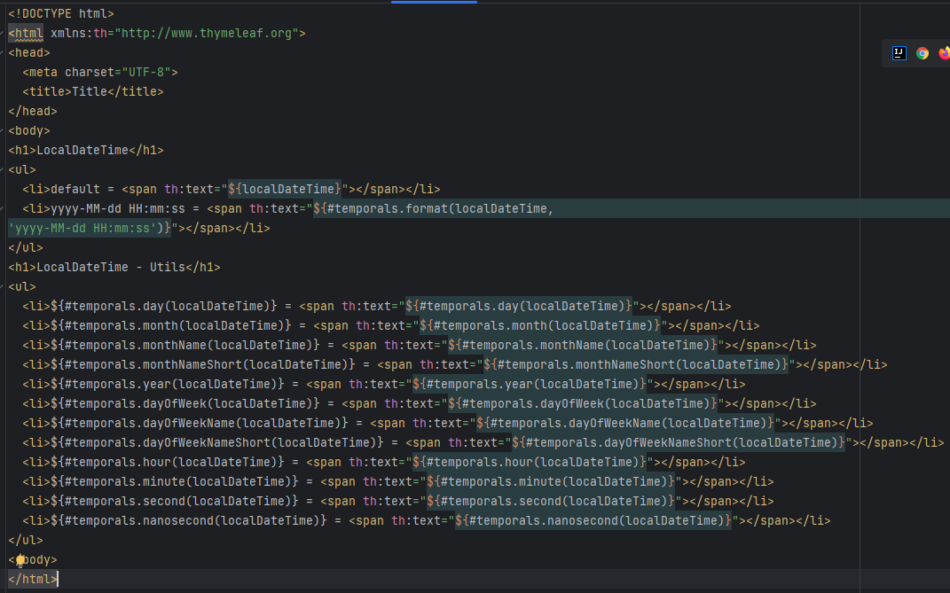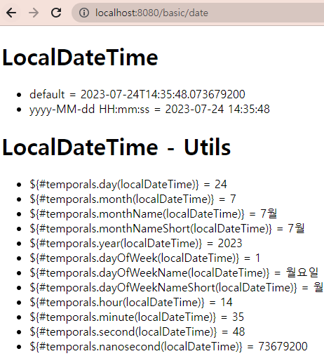 타임리프에서 자바8의 날짜 기능인 LocalDate, LocalDateTime, Instant를 사용하려면 추가 라이브러리(java8time)가 필요한데, 스프링부트 타임리프를 설치하면 기본적으로 들어있다.
