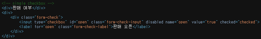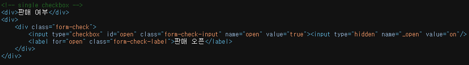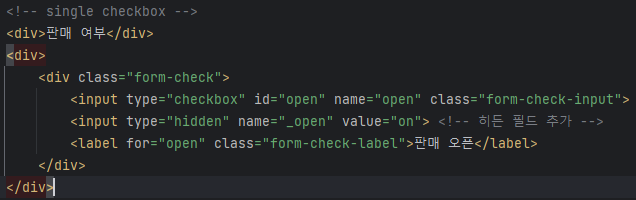 그래서 이건 스프링 자체에서 트릭을 하나 만들었는데, hidden으로 앞에 언더바 _를 붙이고 항상 on을 하는 걸 html에 넣으면 true와 false로 할 수 있다.