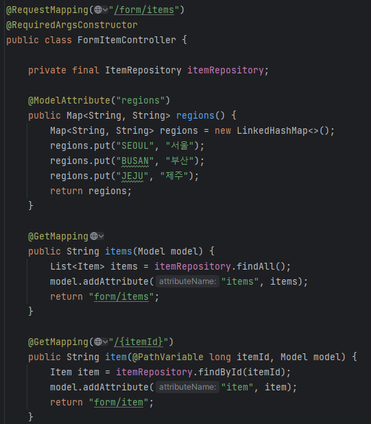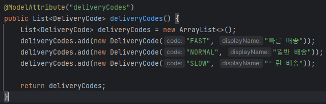 메서드에 @ModelAttribute를 사용하면 해당 모델 아이템은 모든 함수의 모델에 들어간다. 편리성.
