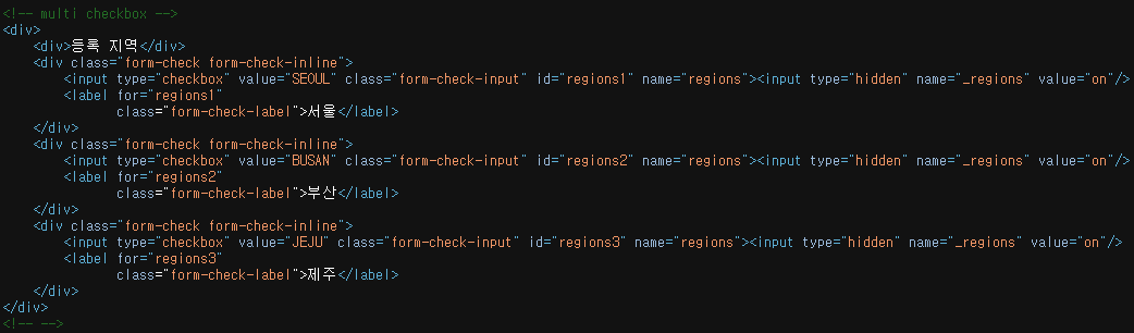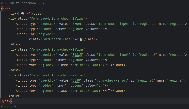 주의해야 할 특징이 있는데, 라디오는 아무것도 체크가 안되어 있으면 null이 들어간다. 즉 hidden _을 생성 안해줌.