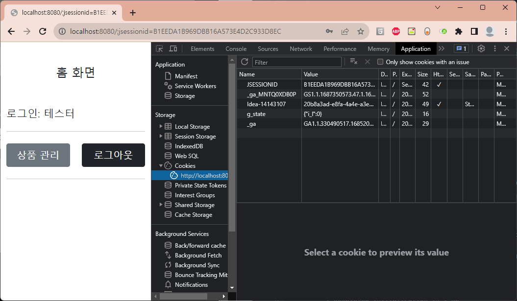 실제로 시간이 지나면 비록 쿠키엔 세션 키가 남아있지만, 서버에서는 삭제되서 해당 세션은 존재하지 않는다고 뜬다.