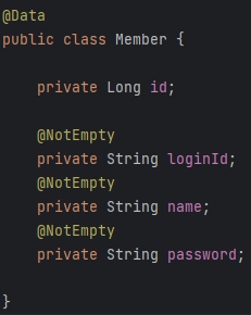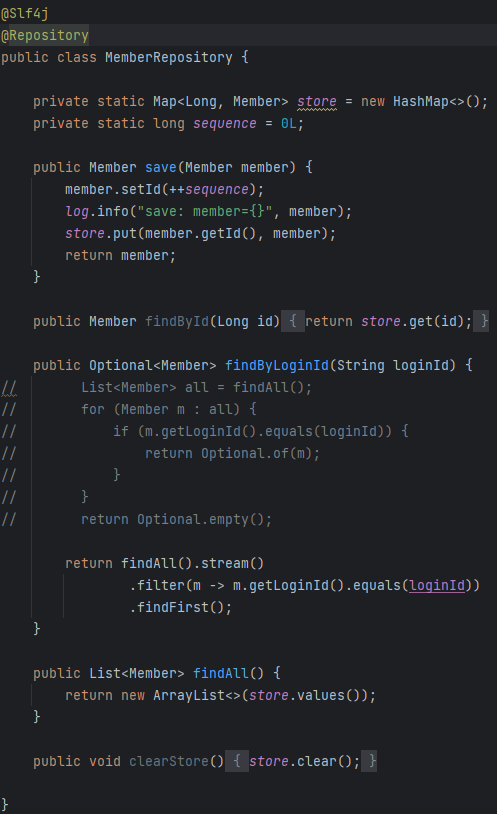 일단 핵심 기능인 멤버 도메인을 정의하고 그 멤버들을 저장하는 레퍼지토리를 만든다. 이때 멤버에도 제약을 둘 수 있고, 원래 이 레퍼지토리를 데이터베이스 같은 곳에 담겠지만 일단 메모리에 저장한다. 멤버를 저장하고 멤버를 불러오는 코드는 레퍼지토리 클래스가 관리한다.
