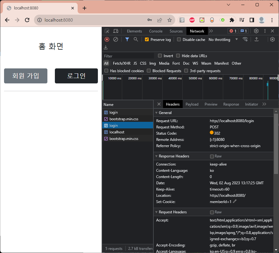 이제 홈 화면에 갔을 때 쿠키를 가지고 와서 만약 로그인 되어 있다면 모델을 이용해 타임 리프에 해당 로그인 정보를 넣어주고, 같은 홈 경로 url이지만 다른 뷰를 리턴함으로써 다른 결과 화면을 보여준다.