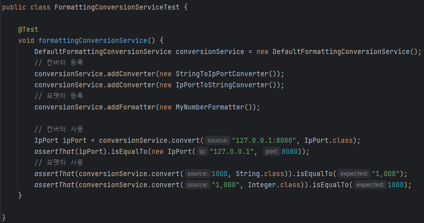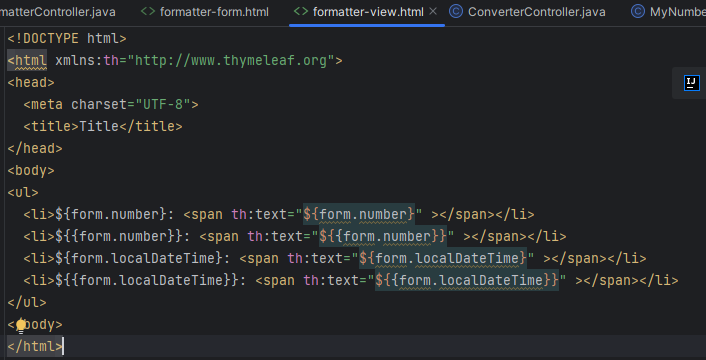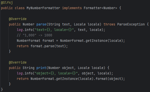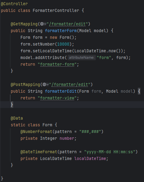 사실 변환이란게 어떤 객체에서 string으로 가던지 string에서 객체로 가던지.. 해서 string을 거쳐가는 경우가 대부분이다. 그래서 스프링 내에서도 이미 대부분 지원하고 있음. 심지어 숫자 변환에서 쉼표 , 붙여주는것 까지 이미 다 있다. 이런 경우는 실생활 형태로 쓰이는걸로 변형된다고 해서 포맷터로 정해서 부른다. 컨버터의 특별한 버전이라고 생각하면 된다.