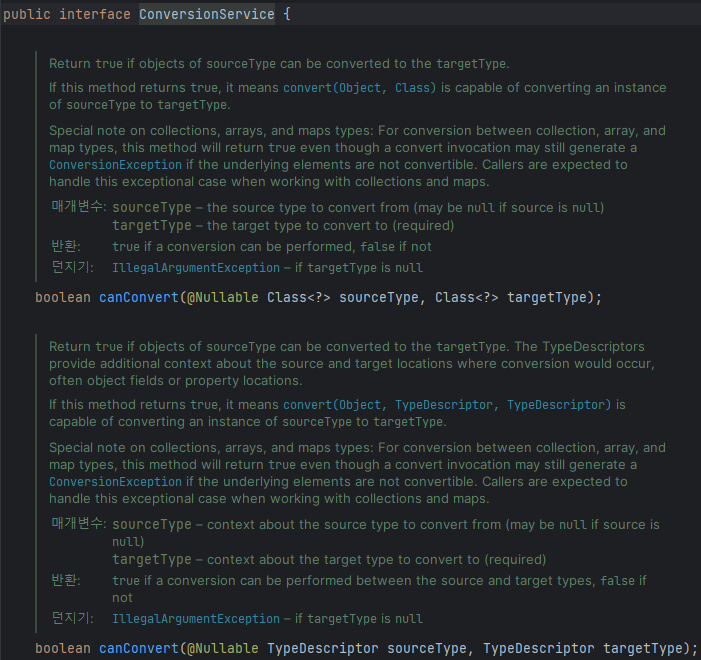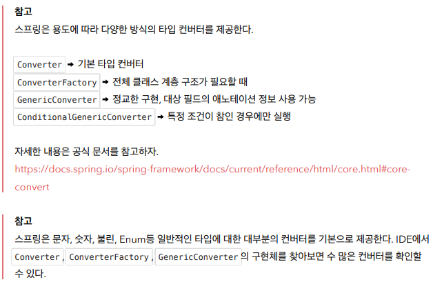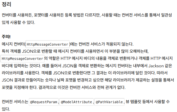 주의할점은 JSON으로 변경하는건 컨버터를 쓰는게 아니다. jackson 라이브러리 같은거 쓰는거다. 이 컨버전 서비스는 @RequestParam, @ModelAttribute, @PathVariable, 뷰 템플릿 등에서 사용할 수 있다.