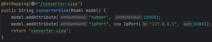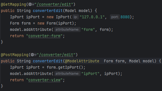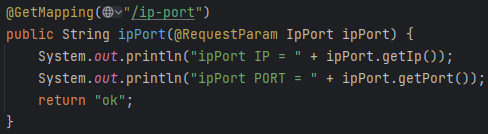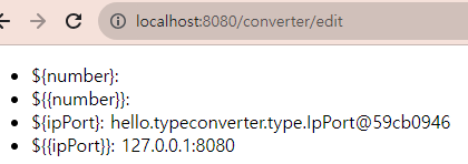 이 경우 괄호를 한번 {} 썼는데도 이상한 객체 주소가 안나오고 string이 제대로 나온 모습이다. 괄호 한번 {}이면 string으로 변환시켜서 출력한다고 했는데 내가 만든 IpPort 클래스를 컨버터를 이용해 변형시켜서 저렇게 글자로 나오는 것. 주목해야 할 건 이걸 제출을 눌러 저 PostMapping으로 넘어갔을 때다.