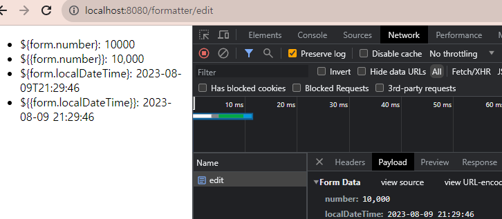 대부분의 컨버터가 객체에서 String으로, String에서 객체로 바뀌는게 대부분이라 @~~Format한 뒤에 pattern으로 형식만 넣어주면 알아서 읽어서 String으로, String에서로 잘 변환한다. form data로 저 string이 그대로 갔는데 컨트롤러에서 알아서 datetime 형식으로 변환하여 받아들인것을 알 수 있다.