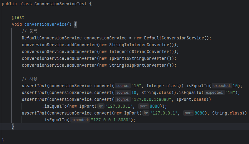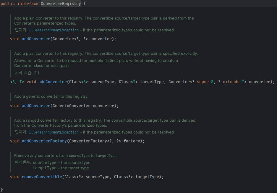 근데 직접 만든걸 자세히 보면 스프링이 관여한 곳이 없다. 직접 컨버터 클래스 만들고 했을 뿐.. 그래서 이렇게 직접 만들어 놓은 컨버터를 컨버전 서비스(ConversionService)라는 곳에 등록해놓고 꺼내쓰기만 하면 된다.