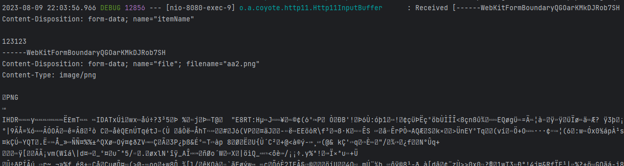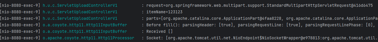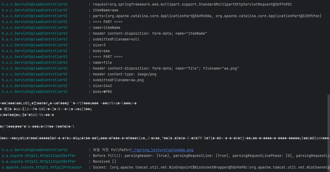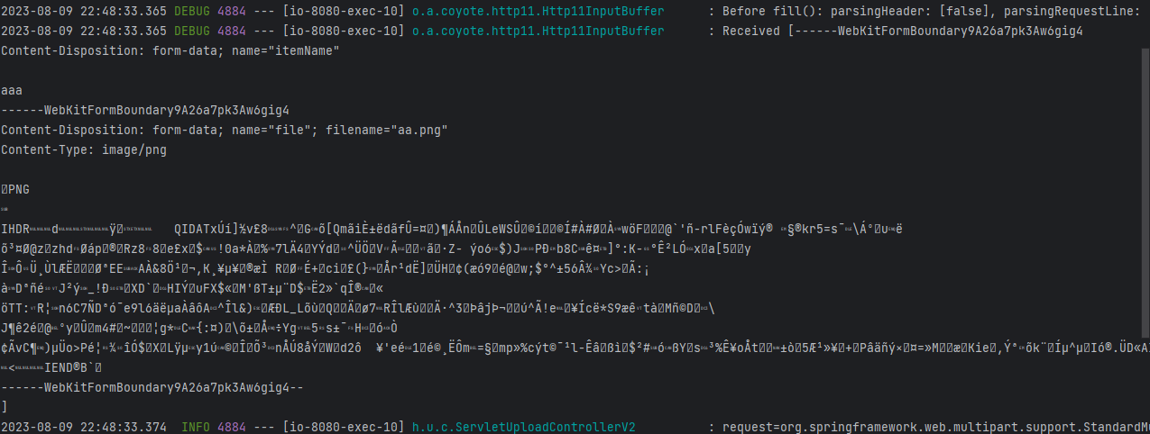 다른 string과 함께 이미지 파일 아무거나 binary 형태로 해서 multipart/form-data로 보낸걸 보면 실제 이론에서 배운것처럼 구분자가 있고 각자의 헤더와 내용이 들어있음을 알 수 있다. 컨트롤러에서 받는 request객체가 처음 보는 객체인데 resolver가 저걸 정해서 해준거다. 참고로 HttpServletRequest의 확장된 자식인 MultipartHttpServletRequest 인터페이스를 구현한 StandardMultipartHttpServletRequest가 있는데 이걸 받으면 .getFile()등 더 추가적인 기능이 가능하다. 하지만 나중에 배울 MultipartFile이 훨씬 편리해서 이것만 쓴다. 또 spring.servlet.multipart.enabled를 false로 설정하면 multipart를 처리안하고 그냥 받아서 parts가 비어있다.