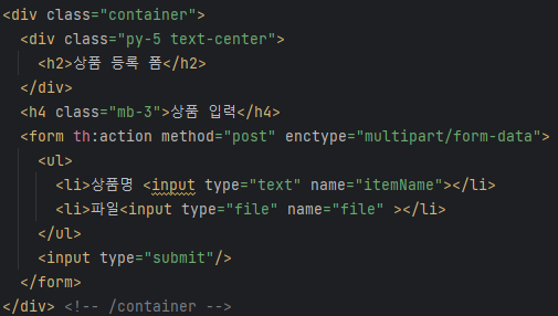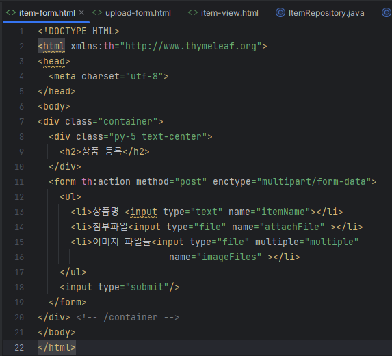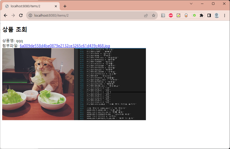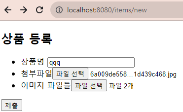 상품 이름이랑 파일 업로드가 된다. 이걸 제출을 누르면 해당 주소로 post를 보내서 컨트롤러의 saveItem이 작동한다. filestore에는 실제로 내 폴더에 저장하는 코드가 있으므로(transferTo) 내 폴더에 저장하는데 이름이 겹치면 안되면서 사용자가 업로드한 이름도 알고 있어야 하므로 이 목적을 위해 만든 Item으로 메모리에 저장한다. 물론 실제로는 db에 저장하고 파일은 s3같은곳에 저장하는게 일반적이다.