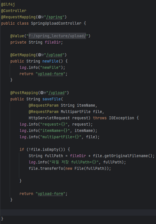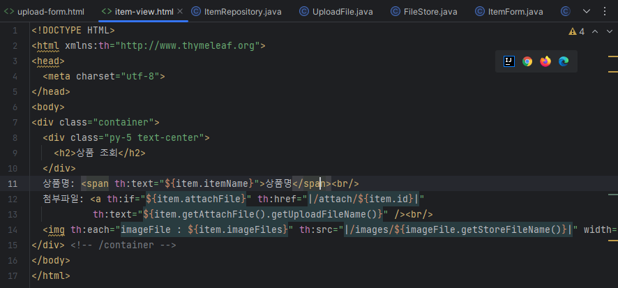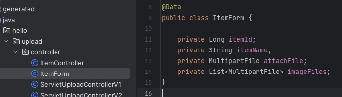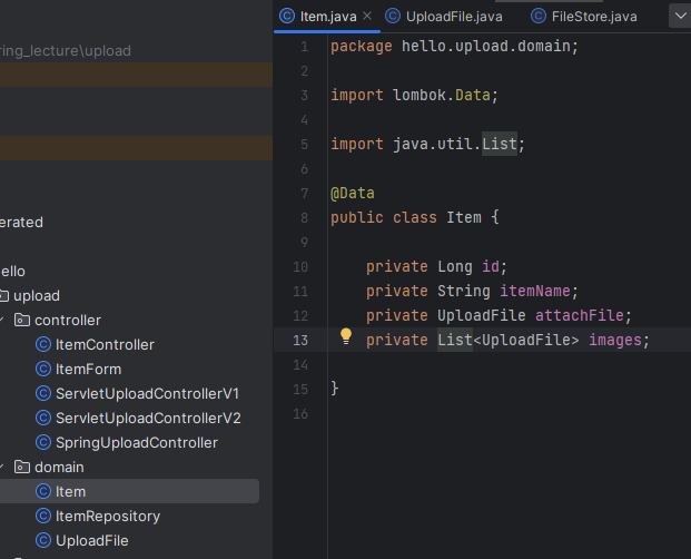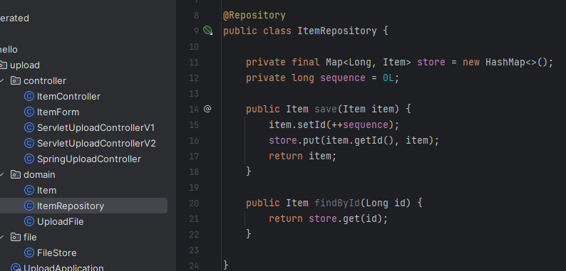 직접 만든 UploadedFile을 변수로 가지고 있는 Item을 ItemRepository에 Map<Long, Item> 형식으로 보관했으므로 메모리에 저장한 실제 객체 경로들을 불러오려면 저장한 long id를 key로 해서 가져올 수 있다. 그렇게 해서 가져와서 id로 보여주는게 컨트롤러 /items/{itemId} 부분임.