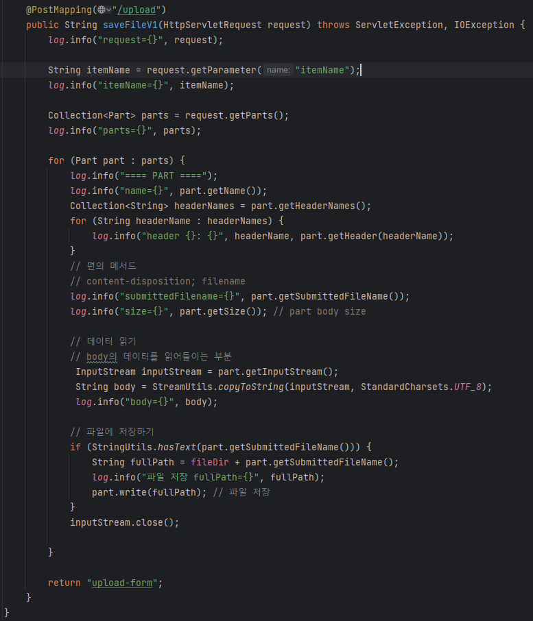 근데 이걸 일일히 해야 할까? 즉 각자의 part 부분을 읽고 그 안에 binary파일이 있으면 stream으로 읽고 저장하는 코드를 직접 짜야 할까? 스프링에서 해당 기능을 당연히 제공한다.
