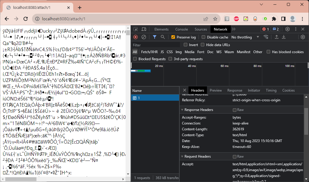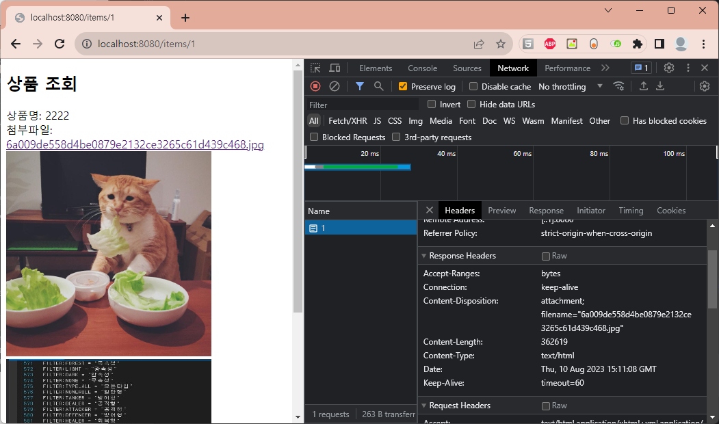 저 파란색의 첨부파일 링크는 클릭하면 저것이 다운받아지도록 했다. 이게 컨트롤러의 /images/{filename}, /attach/{itemId} 부분인데 저렇게만 사용하라는게 아니고 그냥 막 만들어서 사용하면 된다. 주목할건 /attach/{itemId} 함수 부분인데, 마지막에 헤더에 "Content-Disposition"를 붙이고 뒤에 attachment; filename= 해서 넘기는걸 알 수 있다. 이걸 줘서 클라이언트에게 해당 링크로 이동하면 다운받으라고 알려주는 것이다. 만약 없으면 해당 파일의 내용을 그냥 읽게 된다.