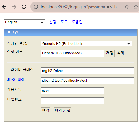 url은 db위치. 여기선 hj2이므로 h2용 db인 test.mv.db 경로다.