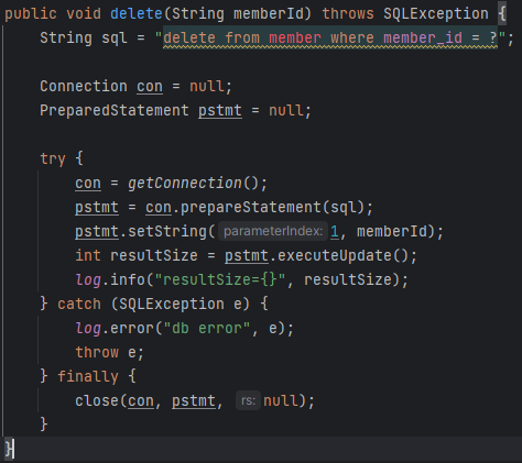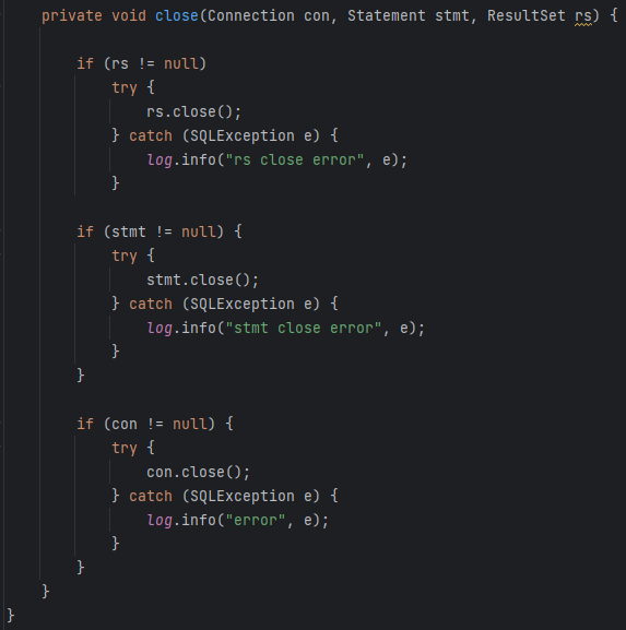 앞에서 설정한 코드인 getConnection을 통해 DriverManager.getConnection(등록한 url 주소 설정들..)을 통해 실제 connection하고, sql문을 작성해서 실행하는 모습이다. ?, ?는 index를 잘 맞춰서 넣으면 된다. 참고할 점은 execute로 실제 수행하는 건데, PreparedStatement를 써야 SQL injection을 방지한다. 저기 ?에 들어가는 걸 데이터로 쳐주기 때문이라고 함. 주의할 점은 실행 후엔 연결을 끊어주지 않으면 리소스를 계속 잡아먹고 있기 때문에 반드시 close해야 하는데 그래서 finally에서 close를 해준다. 순서에 맞게 connection한 대로 역순으로 close해야 하지만 close 할 게 2개라서 만약 앞에서 close하다가 에러가 나면 뒤의 코드가 실행이 안 되서 close가 안되는 일이 일어난다. 그래서 코드가 좀 복잡해지므로 따로 함수로 빼서 작성하는걸 추천한다.