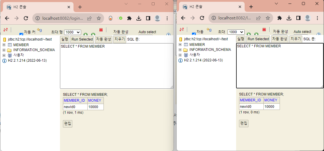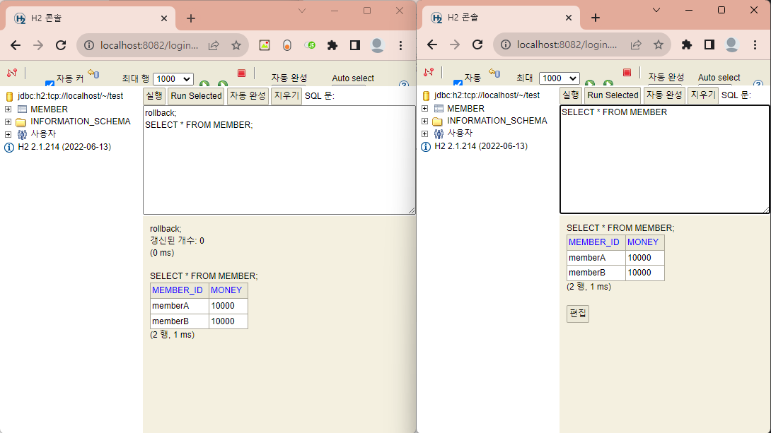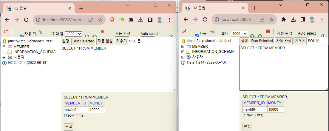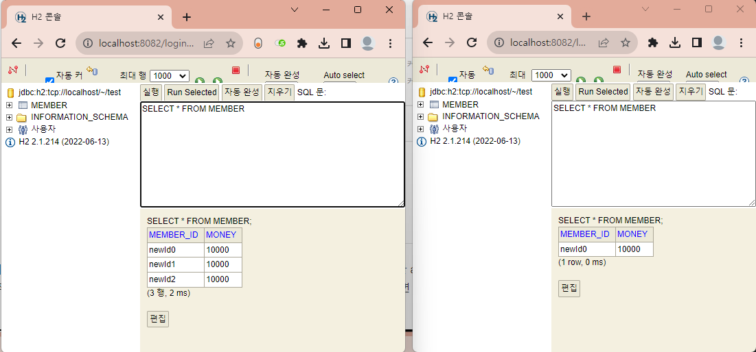 두 개의 세션을 띄워서 비교했을 때, 처음 추가했을 때는 autocommit을 킨 상태로 추가해서 둘 다 들어가있지만 두번째에선 autocommit을 해제한 상태로 한 쪽에서만 추가해보았다. 위에서 말한건 처럼 실제로 추가한 쪽만 조회되고 다른 세션에선 추가가 안된것으로 보인다.