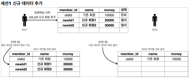 이제 막 추가했지만 아직 커밋은 하지 않은 상태. 커밋을 하기 전에는 임시로 저장한다. 데이터를 추가하고 있는 사람에게는 자신이 추가한 내용이 보이지만 다른 사람에게는 보이지 않는다. 이전까지 그냥 데이터베이스에 추가할 수 있었던건 자동 커밋 기능을 사용하고 있었기 때문. 만약 아직 커밋도 하지 않았는데 조회가 가능하면 저장 안되고 롤백 되었을 때 큰 문제가 될 수 있다. 설정할 순 있지만 위험함.
