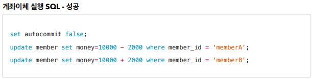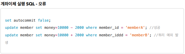 아직 트랜젝션 사용하기 전이다. 아니 정확히는 사용하고 있지만 오토로 설정되어 있어서 한줄 할 때마다 실행되어 저 계좌이체를 하는 두 가지를 실행하는걸 하나로 하는 원자성이 보장이 안된다는 것이다.