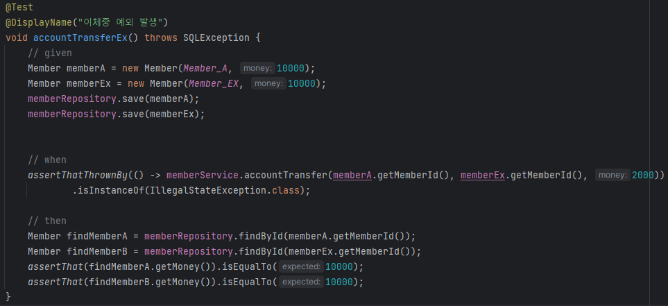 그래서 아직 계좌이체를 하는 전체 함수 자체를 트랙젝션으로 묶지 않아서 중간에 실패해도 돌아오지 않고 그대로 감소한 채로 저장되는 심각한 문제가 발생한다.
